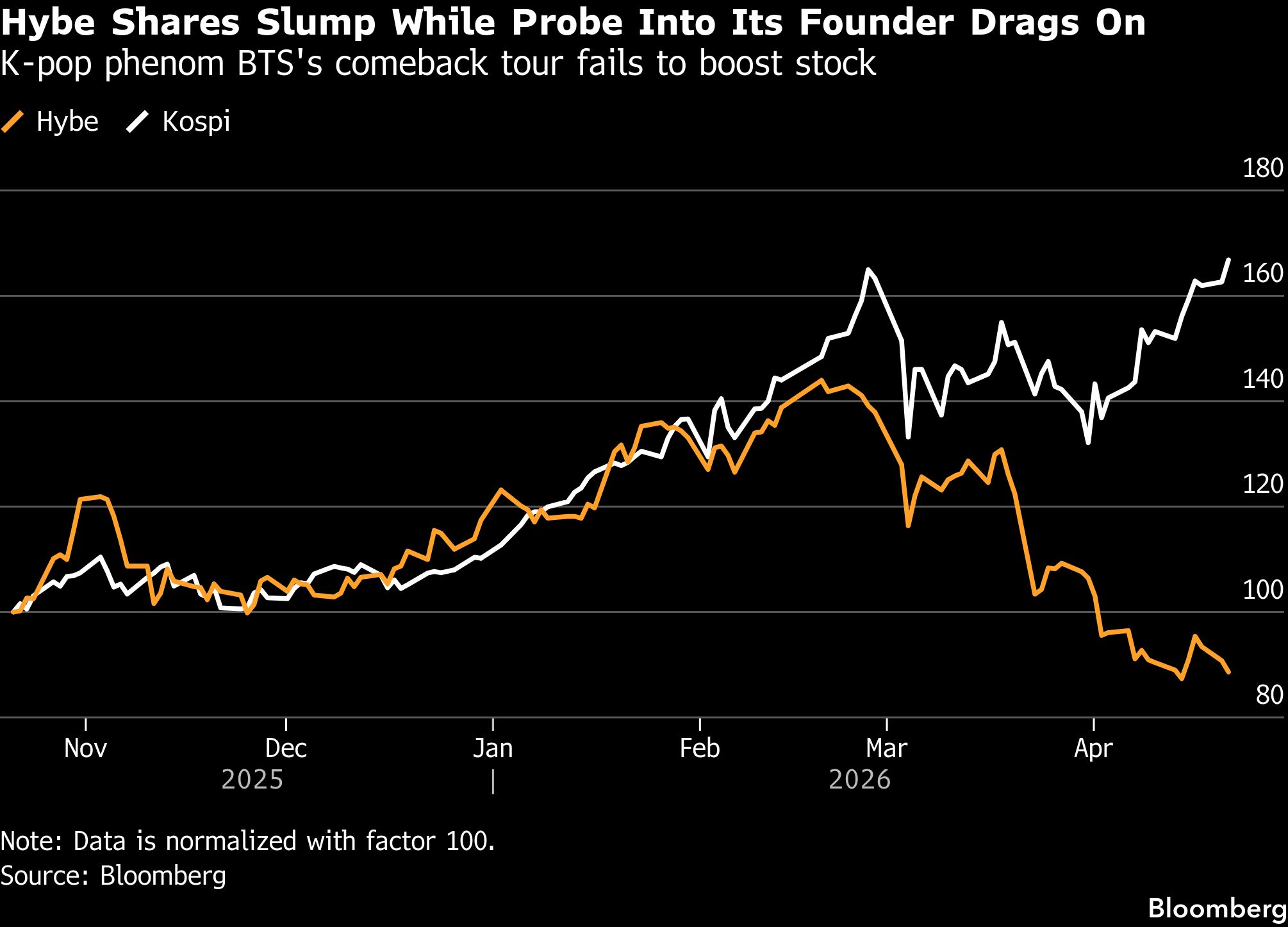 Saham Hybe sempat turun hingga 4,3% di Seoul, mencapai level intraday terendah dalam hampir satu tahun, sementara indeks acuan Kospi melonjak lebih dari 2% pada hari Selasa.