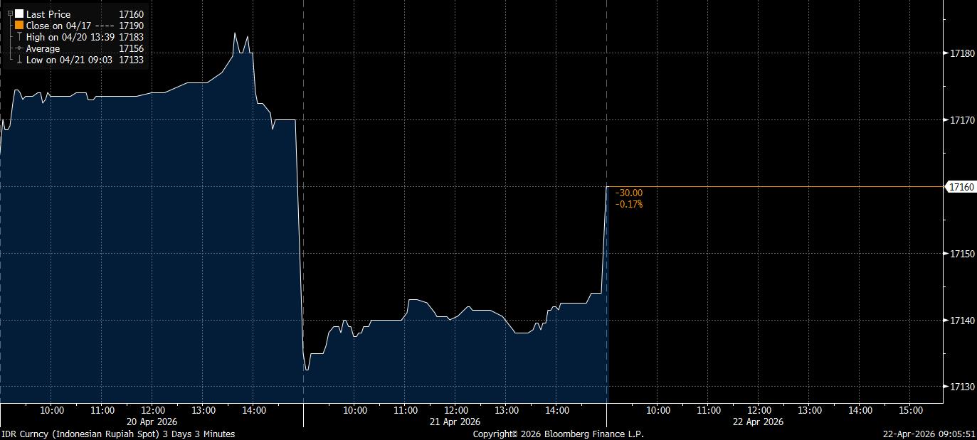 Bloomberg Technoz, Jakarta - Rupiah di pasar spot melemah di tengah potensi jeda perang antara Amerika Serikat (AS) dan Iran, serta ekspektasi pasar jelang pengumuman arah suku bunga acuan oleh Bank Indonesia.