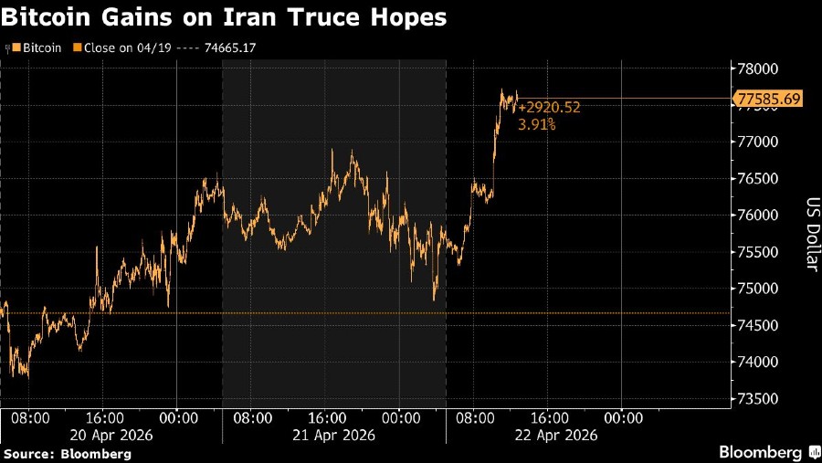 Bloomberg, Bitcoin mengalami pertumbuhan harga sejalan dengan pasar ekuitas di Amerika Serikat (AS) pada Rabu, mencapai level tertinggi dalam 11 pekan usai Presiden Donald Trump menyatakan akan memperpanjang gencatan senjata dengan Iran, yang memperkuat kepercayaan pasar. Aset digital kripto pertama ini naik hingga 3,6%, sempat menembus US$78.400, harga tertinggi sejak 3 Februari. Pada pukul 06.40 pagi di London, Bitcoin diperdagangkan di sekitar US$78.000. Aset kripto lainnya juga menguat, dengan Ether naik hingga 3,8%.
