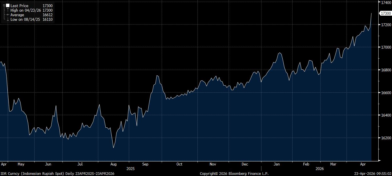 Bloomberg Technoz, Jakarta - Pergerakan rupiah di pasar spot semakin melemah pada perdagangan Kamis (23/4/2026), di tengah kembali melambungnya harga minyak mentah dunia ke atas US$100 per barel.