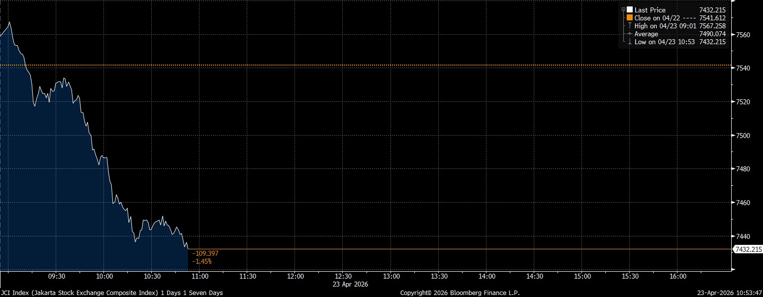 Bloomberg Technoz, Jakarta - Indeks Harga Saham Gabungan (IHSG) terpeleset di zona merah hingga tertekan amat dalam. IHSG melemah 109,39 poin atau setara 1,45% ke level 7.432 jelang penutupan sesi satu siang ini, Kamis (23/4/2026).