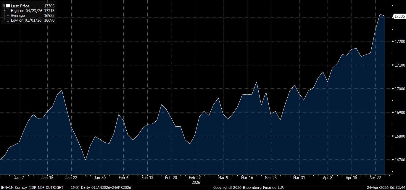 Pada pembukaan hari ini, Jumat (24/4/2026), rupiah offshore stagnan dengan perubahan sedikit 0,01%. Meski begitu, rupiah di pasar luar negeri terjepit oleh kenaikan harga minyak mentah Brent yang melonjak 1,13% ke US$106,26 per barel, berdasarkan data realtime Bloomberg per 07:35 WIB.