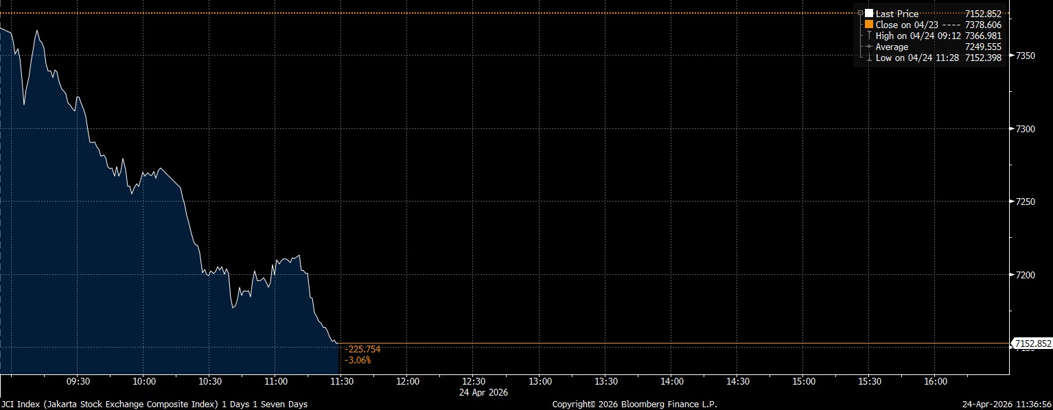 Bloomberg Technoz, Jakarta - Penurunan Indeks Harga Saham Gabungan (IHSG) bertambah dalam. IHSG bahkan telah amblas 3% lebih pada perdagangan Sesi I, Jumat (24/4/2026).