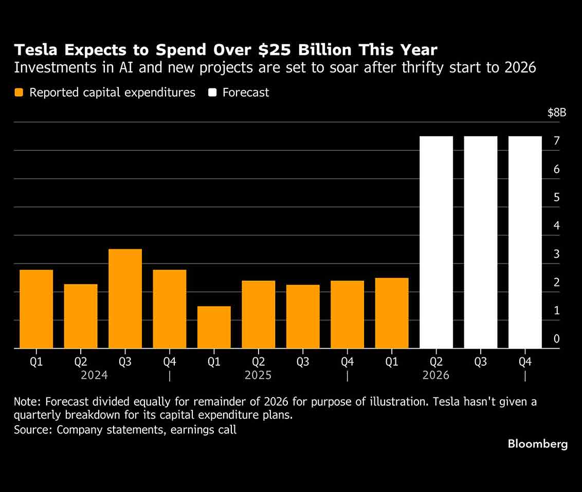 Akan tetapi, untuk tiga bulan pertama tahun 2026, Tesla menghabiskan kurang dari US$2,5 miliar — tertinggal di bawah pengeluaran rata-rata per kuartal yang dibutuhkan perusahaan untuk mencapai perkiraan pengeluaran tahunannya. Hal ini berkontribusi pada Tesla yang mencatat arus kas bebas positif sebesar US$1,4 miliar untuk kuartal tersebut, jauh lebih baik daripada perkiraan analis bahwa produsen mobil tersebut akan menghabiskan hampir US$1,9 miliar.