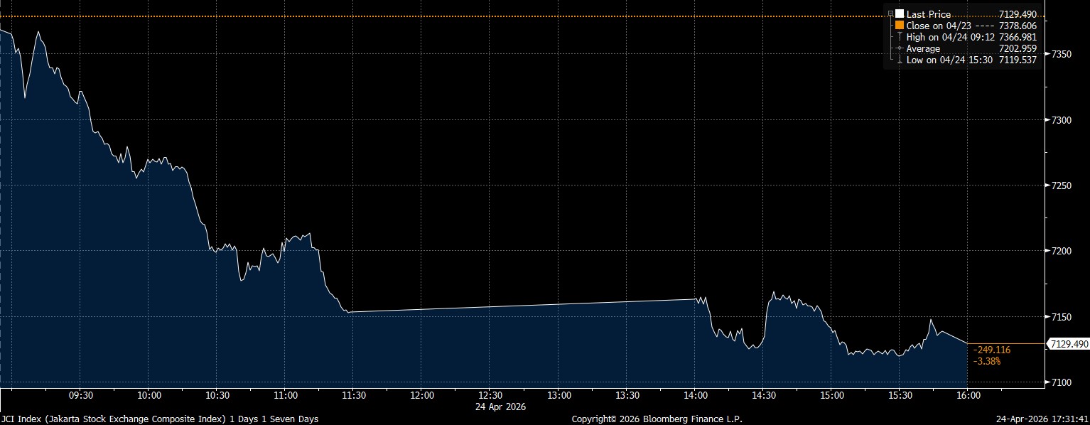 Pada Jumat (24/4/2026), IHSG ditutup di posisi 7.129,49 pada penutupan perdagangan. Amblas 3,38% dan 249,11 poin dibandingkan penutupan perdagangan hari sebelumnya.