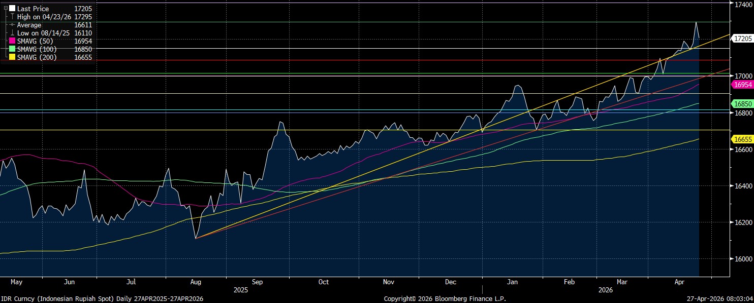 Secara teknikal, rupiah masih ada risiko melemah pada perdagangan hari ini. Target pelemahan menuju Rp17.250/US$. Level selanjutnya kemungkinan tertahan di Rp17.300/US$ dengan tertembusnya support kuat dari posisi sebelumnya.