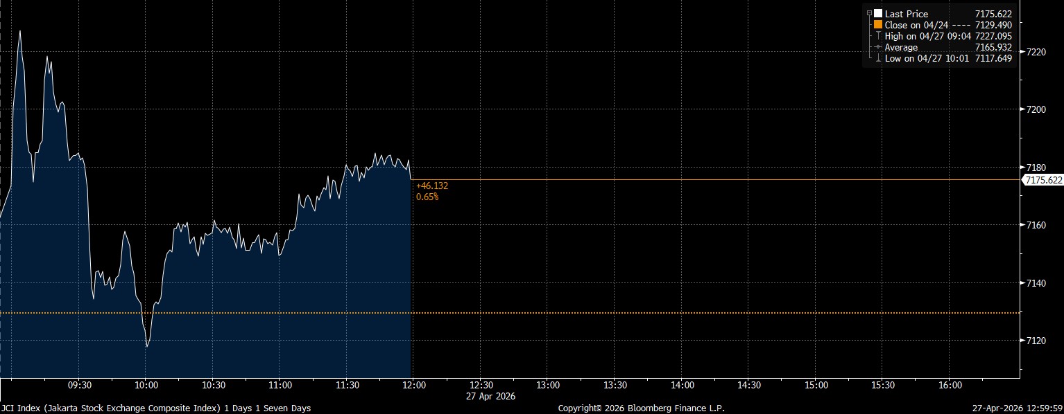 Bloomberg Technoz, Jakarta - Indeks Harga Saham Gabungan (IHSG) berhasil menguat 0,65% di posisi 7.175,62 pada perdagangan Sesi I, Senin (27/4/2026) dengan penguatan saham Amman Mineral (AMMN), BREN, hingga BRPT yang jadi penopang.
