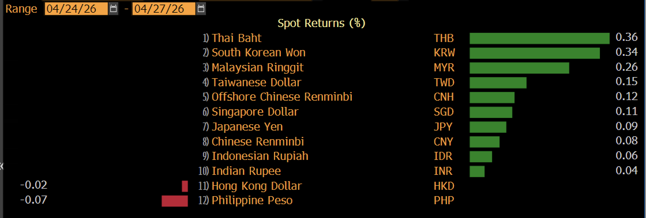 Baht Thailand memimpin penguatan, disusul won Korea Selatan, ringgit Malaysia, dolar Taiwan, yuan offshore, dolar Singapura, yen Jepang, yuan China, rupiah, dan rupee India. Sebaliknya, hanya peso Filipina dan dolar Hong Kong yang terlihat melemah terbatas.