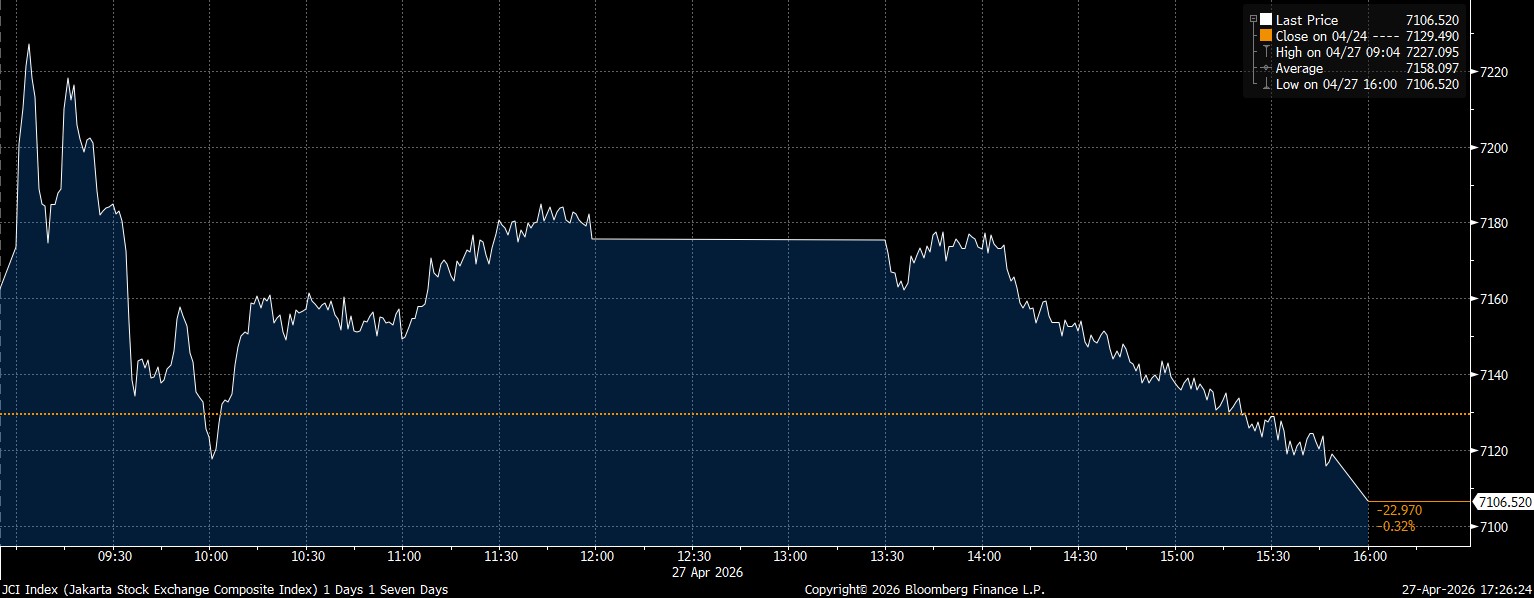 Bloomberg Technoz, Jakarta - Indeks Harga Saham Gabungan (IHSG) berbalik arah hingga terjerumus di zona merah dengan melemah 0,32% di posisi 7.106,52 pada Senin (27/4/2026). Turunnya saham–saham big caps jadi sebab, saham DSSA dan saham Astra International (ASII), misalnya.
