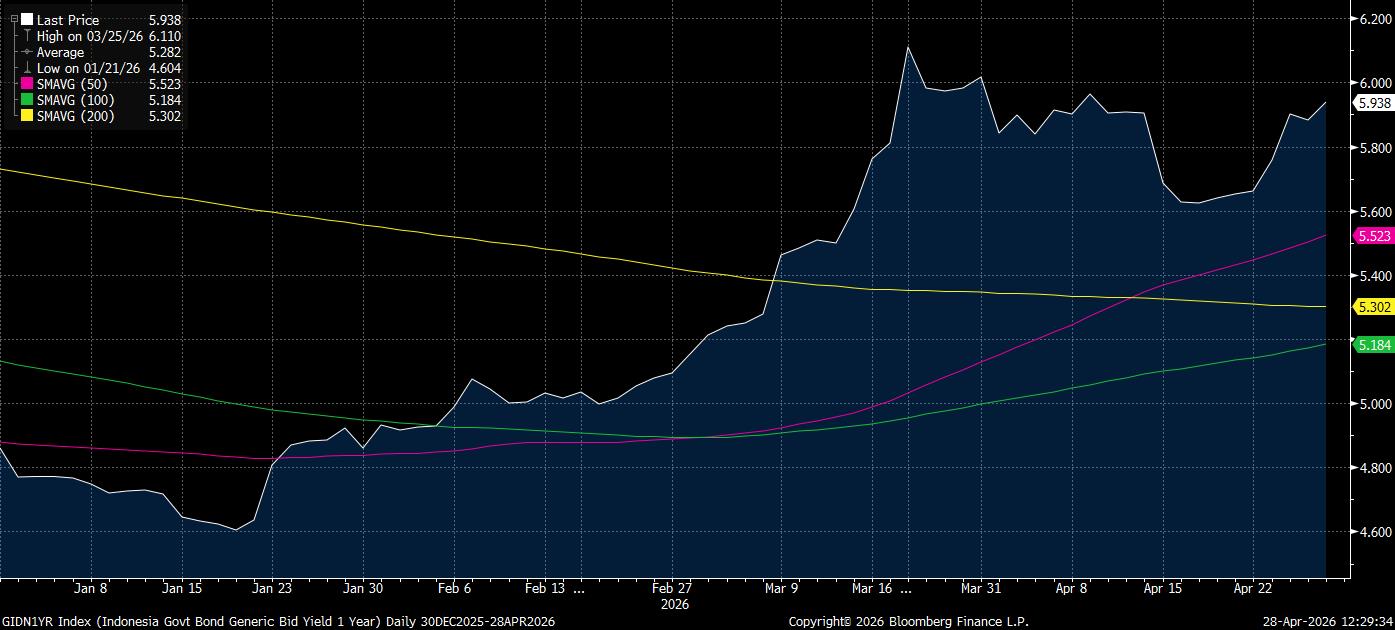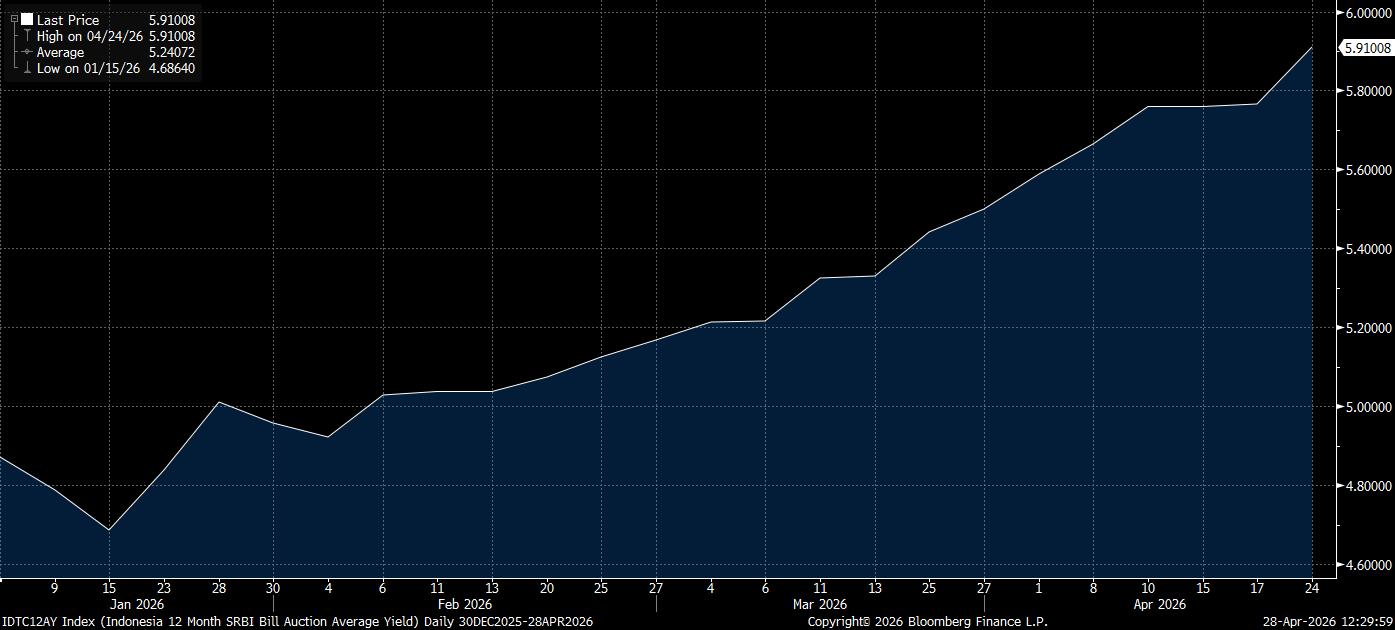 Berdasarkan data dari BI yang dihimpun Bloomberg, imbal hasil SRBI 12 bulan tercatat terus menanjak ke hampir 6% dan mencatatkan posisi tertinggi sejak Juni 2025.