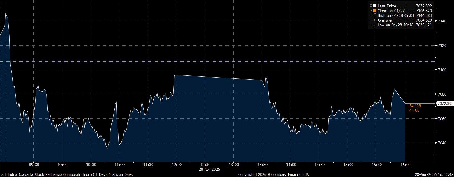Bloomberg Technoz, Jakarta - Indeks Harga Saham Gabungan (IHSG) ditutup di zona merah dengan pelemahan 0,48% di posisi 7.072 pada penutupan perdagangan Selasa (28/4/2026).