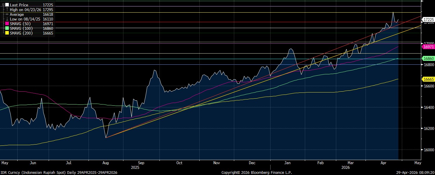 Secara teknikal, rupiah masih berisiko melanjutkan tren pelemahan hari ini. Adapun rupiah kemungkinan melemah menembus support level Rp17.250/US$. Support selanjutnya bisa menuju Rp17.300/US$.