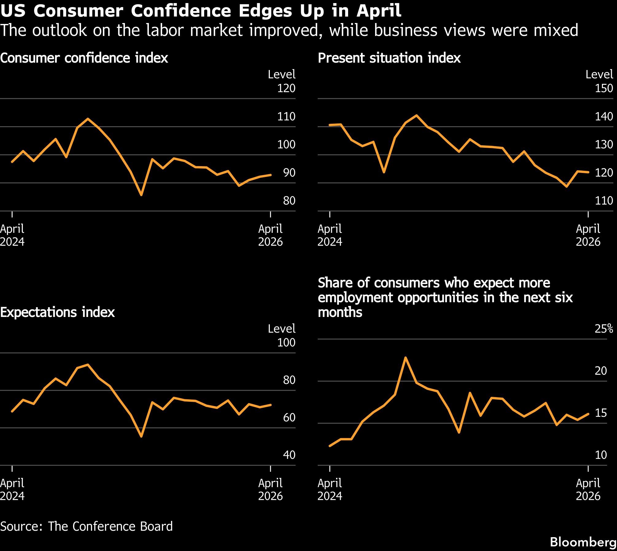 Laporan tersebut menunjukkan bahwa ukuran ekspektasi untuk enam bulan ke depan melonjak pada bulan April, meskipun penilaian terhadap kondisi saat ini sedikit melemah.