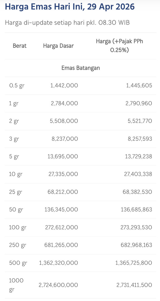 Pada Rabu (29/4/2026), emas Antam dihargai Rp 2.784.000/gram. Melemah Rp 30.000 dibandingkan posisi kemarin.
