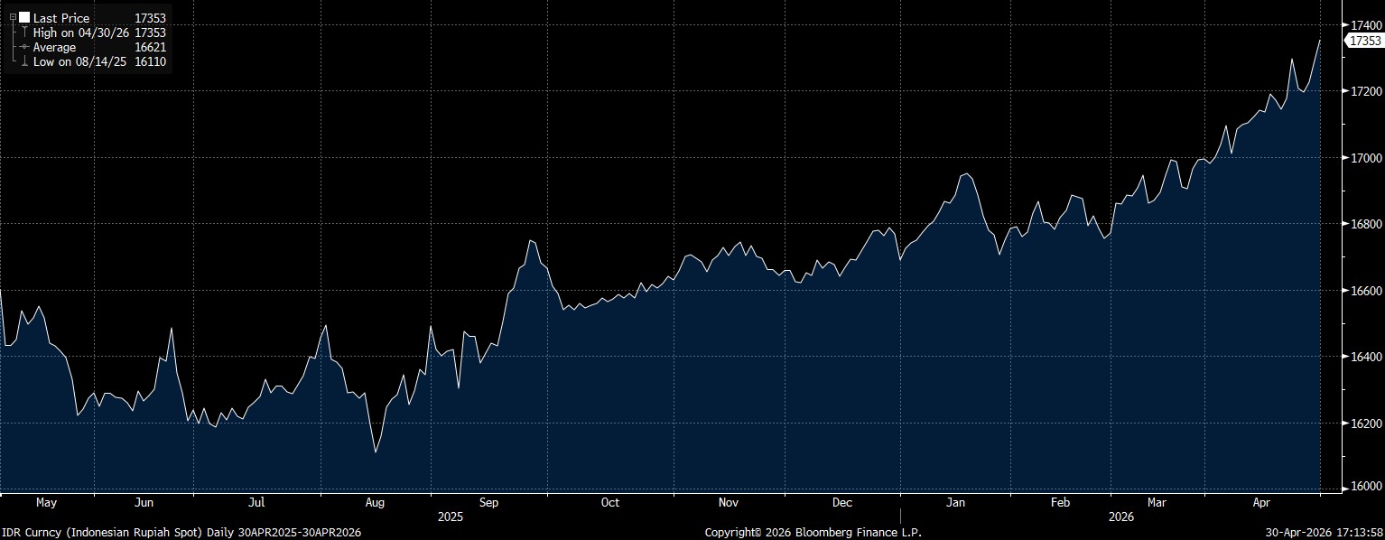 Pelemahan rupiah utamanya tersengat tensi geopolitik Timur Tengah yang kembali mengencangkan sentimen risk–off. Presiden AS Donald Trump melontarkan ancaman keras untuk mempersiapkan perpanjangan blokade Angkatan Laut AS di Selat Hormuz, seperti yang dilaporkan Bloomberg News.