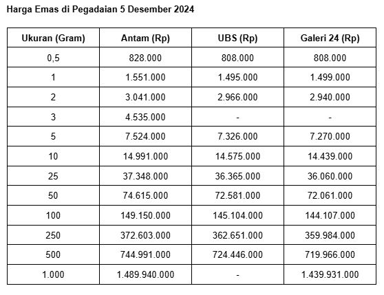 Kemudian untuk emas batangan cetakan PT Untung Bersama Sejahtera (UBS), ukuran 0,5 gram dihargai Rp 808.000. Berkurang Rp 1.000 dibandingkan hari sebelumnya.
