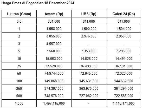 Pegadaian adalah salah satu anak usaha PT Bank Rakyat Indonesia (Persero) Tbk (BBRI). Berikut perkembangan harga emas batangan di Pegadaian hari ini, sebagaimana dikutip dari situs Sahabat Pegadaian: