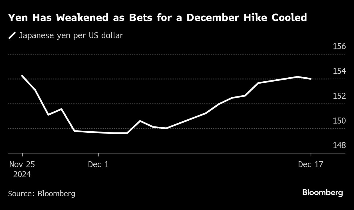 Gubernur Kazuo Ueda dan dewan BOJ diperkirakan akan mempertahankan suku bunga acuan pada 0,25% di akhir rapat yang digelar selama dua hari, menurut pandangan para pedagang yang tercermin dalam Overnight Indexed Swap Rates (OIS Rates) terbaru. Lebih dari setengah ekonom saat ini memprediksi kenaikan suku bunga pada Januari, sementara 44% lainnya masih mengharapkan hal tersebut terjadi minggu ini, menurut survei Bloomberg bulan ini.
