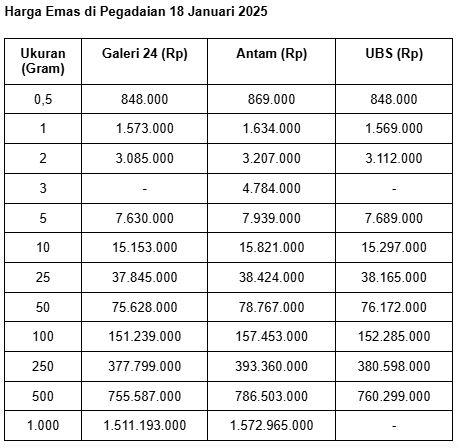 Sementara ukuran 1 gram, harga emas Galeri 24 adalah Rp 1.573.000. Naik Rp 13.000 dalam sehari.