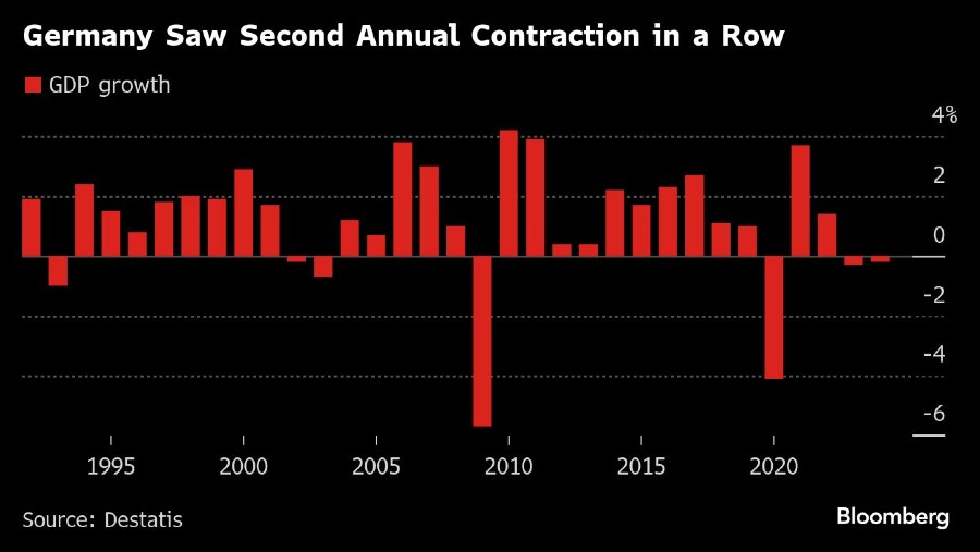 Ekonomi Jerman menyusut selama dua tahun berturut-turut pada tahun 2024 dan mungkin tidak akan tumbuh banyak pada tahun 2025, menjadi tantangan bagi pemerintah baru negara itu setelah Pemilu mendadak diadakan pada Februari. Produk domestik bruto (PDB) turun 0,2% setelah turun 0,3% pada tahun 2023.