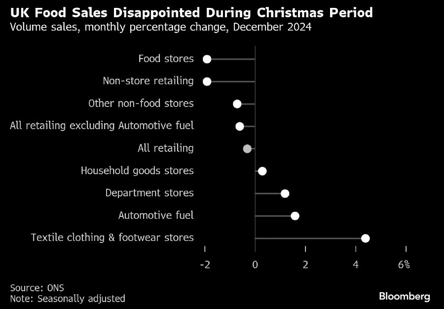 Penjualan ritel Inggris melemah sekitar periode Natal krusial bulan lalu, kabar buruk terbaru bagi pemerintah Partai Buruh yang ingin menghidupkan kembali pertumbuhan ekonomi. Meski pendapatan riil meningkat, rumah tangga sedang waspada terhadap kenaikan inflasi dan ekspektasi biaya pinjaman menurun lebih lambat.