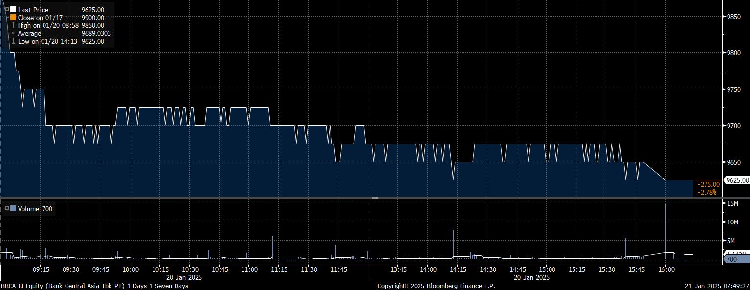 Adapun investor asing mencatat net sell yang amat banyak pada saham PT Bank Central Asia Tbk (BBCA) mencapai Rp799,71 miliar. Imbas tekanan jual, saham BBCA melemah 2,78% dan ditutup di posisi Rp9.625/saham.