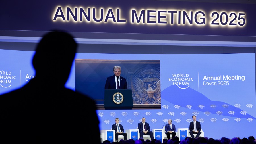 Trump muncul secara virtual di forum WEF — pada umpan video yang memperlihatkan dia di belakang podium, diapit oleh gambar segel berukuran jumbo di Meja Resolute presiden di Ruang Oval. Umpan video Trump melayang di atas para eksekutif di panggung di panel tersebut.