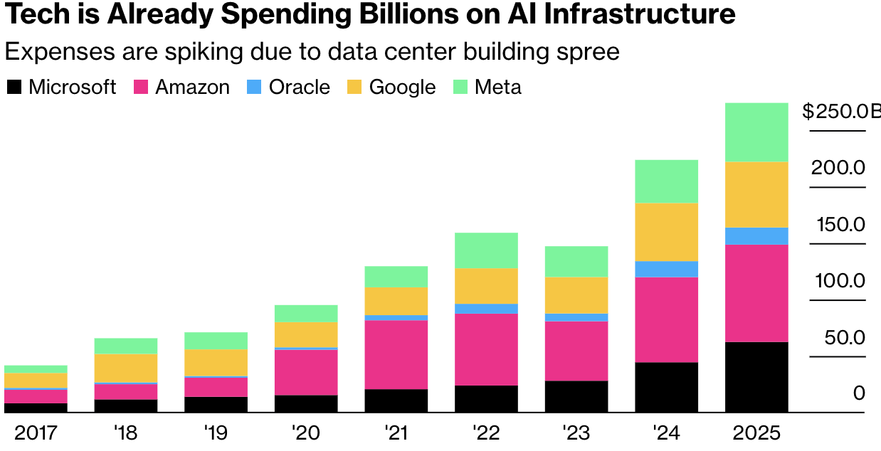 Amazon memproyeksikan belanja modal sekitar US$75 miliar pada tahun 2024, dan jumlah yang meningkat tahun ini, sebagian besar untuk infrastruktur teknologi seperti chip dan pusat data yang mendukung kecerdasan buatan. Meta mengatakan akan menginvestasikan sebanyak US$65 miliar untuk proyek-proyek yang berhubungan dengan AI pada tahun 2025. Dan Microsoft mengatakan akan menghabiskan US$80 miliar untuk pusat data AI pada tahun fiskal ini.