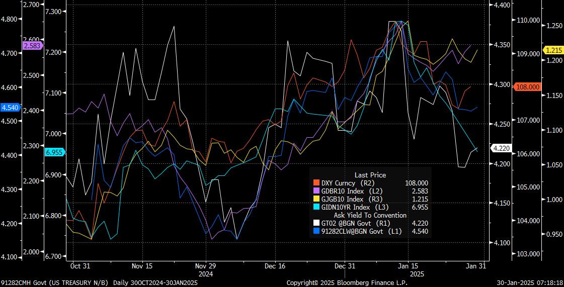Pembacaan atas sinyal The Fed itu telah membuat 'taruhan' di pasar Treasury memudar. Yield surat utang AS naik lagi di mana tenor 2Y yang paling sensitif dengan kebijakan suku bunga, naik 2,5 basis poin ke level 4,22%. Sedangkan tenor 10Y naik tipis 0,4 basis poin menjadi 4,53%.