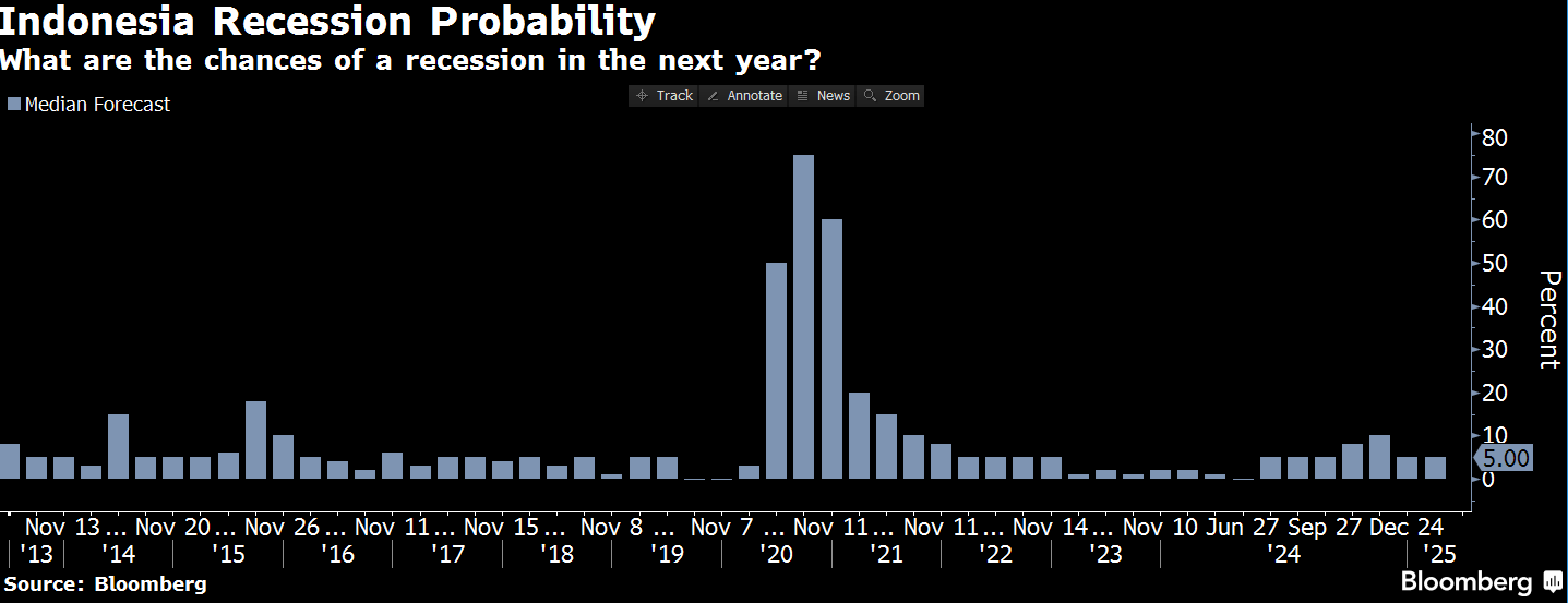Survei Bloomberg juga mencatat, tingkat pengangguran di Indonesia tahun ini kemungkinan akan meningkat jadi 5%, setelah pada 2024 tercatat sebesar 4,9%.