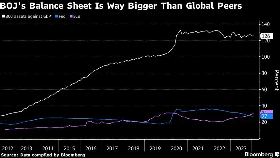 Namun, skala relatif dari kepemilikan BOJ, mencapai 126% dari ekonomi negara itu, jauh lebih besar dari Federal Reserve (The Fed) atau Bank Sentral Eropa yang hanya sekitar 30% dari produk domestik bruto (PDB).
