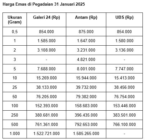 Sementara ukuran 1 gram, harga emas Galeri 24 adalah Rp 1.585.000. Minus Rp 1.000 dari sehari sebelumnya.
