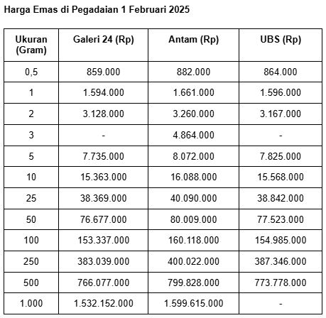 Sementara ukuran 1 gram, harga emas Galeri 24 adalah Rp 1.594.000. Surplus Rp 9.000 dari sehari sebelumnya.
