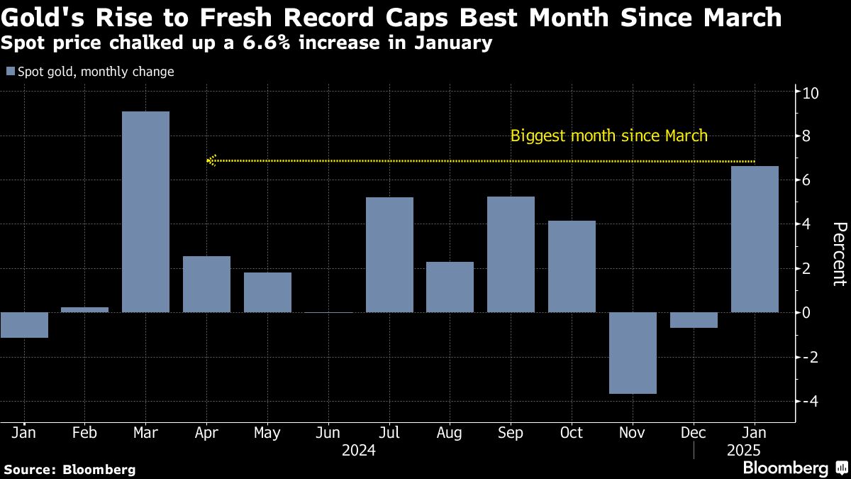 Harga emas mendekati level tertinggi sepanjang masa setelah permintaan terhadap aset safe haven melonjak. Pada Januari, harga emas mencatat kenaikan bulanan terbesar sejak Maret. Para investor mencari perlindungan dari ketidakpastian akibat kebijakan tarif Trump serta dampaknya terhadap inflasi dan ekonomi global. Pelemahan dolar AS—yang menjadi acuan harga emas—juga turut mendorong kenaikan logam mulia ini.