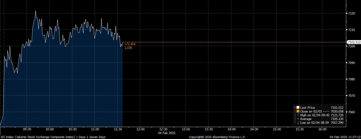 Bloomberg Technoz, Jakarta - Indeks Harga Saham Gabungan (IHSG) berhasil rebound pada perdagangan pagi hari ini dengan kembali ke zona 7.100-an, dengan penguatan 72,45 poin atau setara dengan kenaikan 1,03% ke level 7.102,51 pada perdagangan Sesi I, Selasa (4/2/2025).