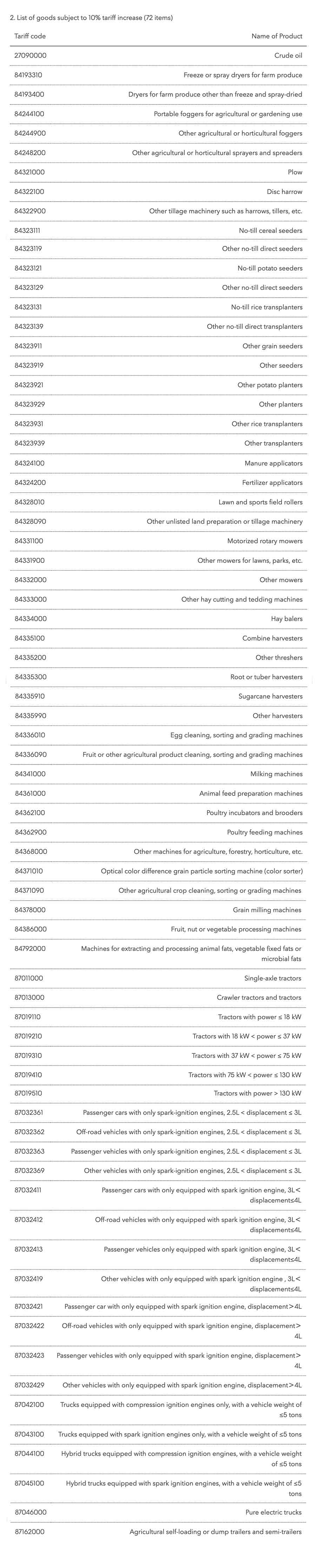 2. Tarif sebesar 10% akan dikenakan pada minyak mentah, mesin pertanian, mobil berkapasitas besar, dan truk pikap. Kisaran barang-barang tertentu ditunjukkan pada Lampiran 2.