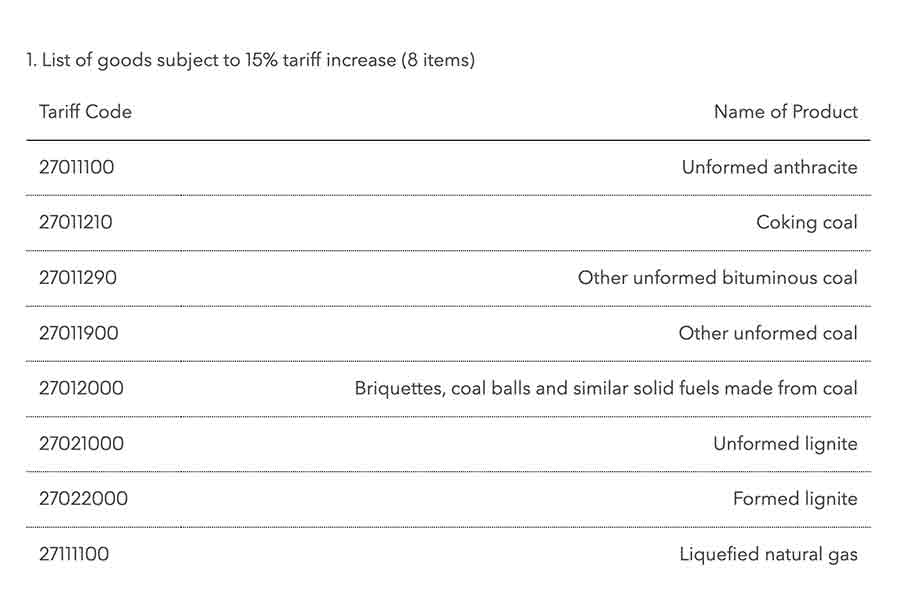 1. Tarif sebesar 15% akan dikenakan pada batu bara dan gas alam cair. Kisaran barang-barang tertentu ditunjukkan pada Lampiran 1.