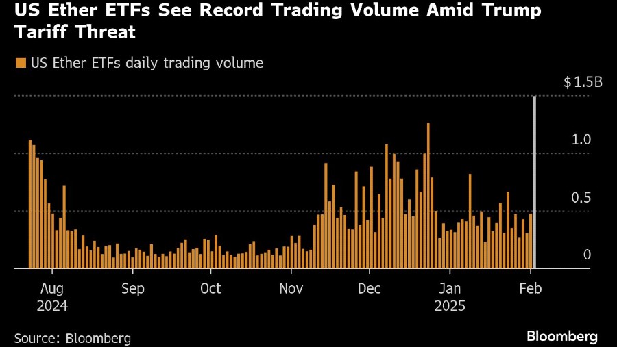 Sementara ETF Ether mengalami rekor volume perdagangan pada hari Senin waktu AS karena posisi leverage dalam aset digital turun tajam, terguncang oleh ketegangan perdagangan yang sedang berlangsung di bawah pemerintahan Trump.