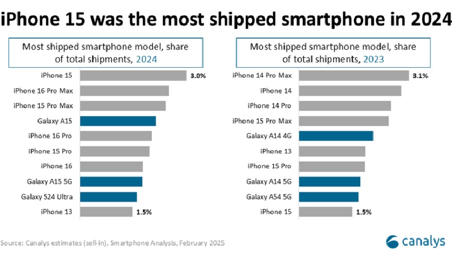 Canalys hanya menuliskan bahwa total pangsa pasar pengiriman smartphone terbesar ada pada iPhone 15 (3%) dan terkecil pada iPhone 13 (1,5%).