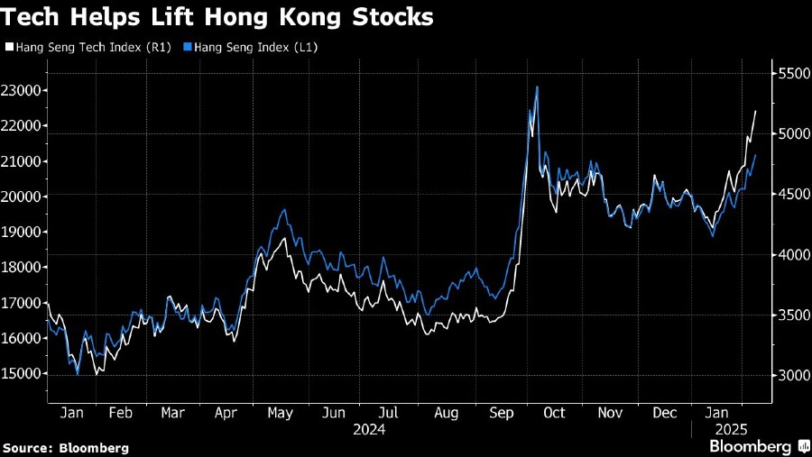 Indeks Teknologi Hang Seng naik sebanyak 2,9%. Kenaikan ini mendorong indeks menguat lebih dari 20% dari level terendah pada Januari, memenuhi definisi pasar bullish, setelah model kecerdasan buatan (AI) murah dari perusahaan rintisan DeepSeek memicu ketertarikan pada perusahaan-perusahaan internet China.