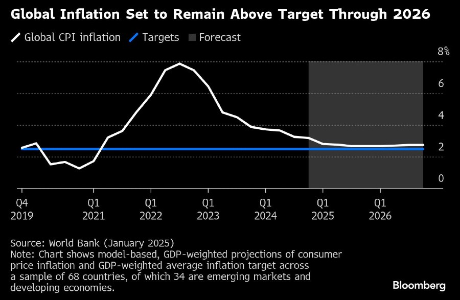 Survei Bank of America terhadap para manajer investasi global di bulan Januari menunjukkan munculnya kembali pertumbuhan harga konsumen global sebagai tema utama untuk tahun 2025. Bank Dunia memperkirakan perlambatan inflasi namun tetap memperingatkan bahwa inflasi “bisa jadi lebih tinggi dari yang diperkirakan.”