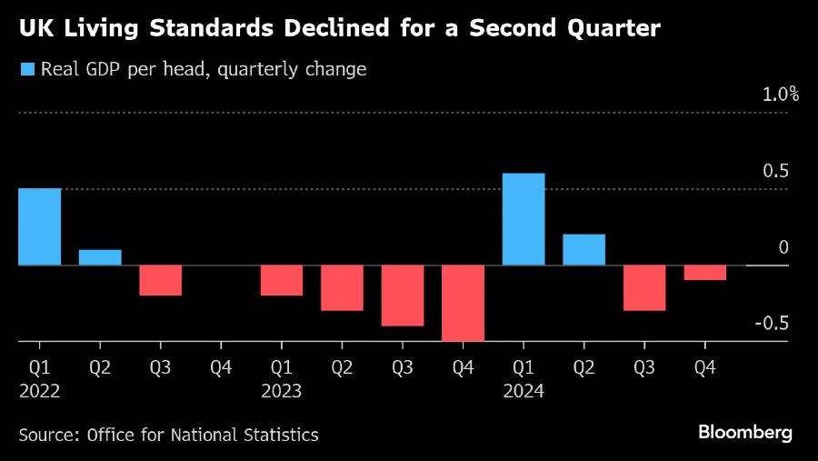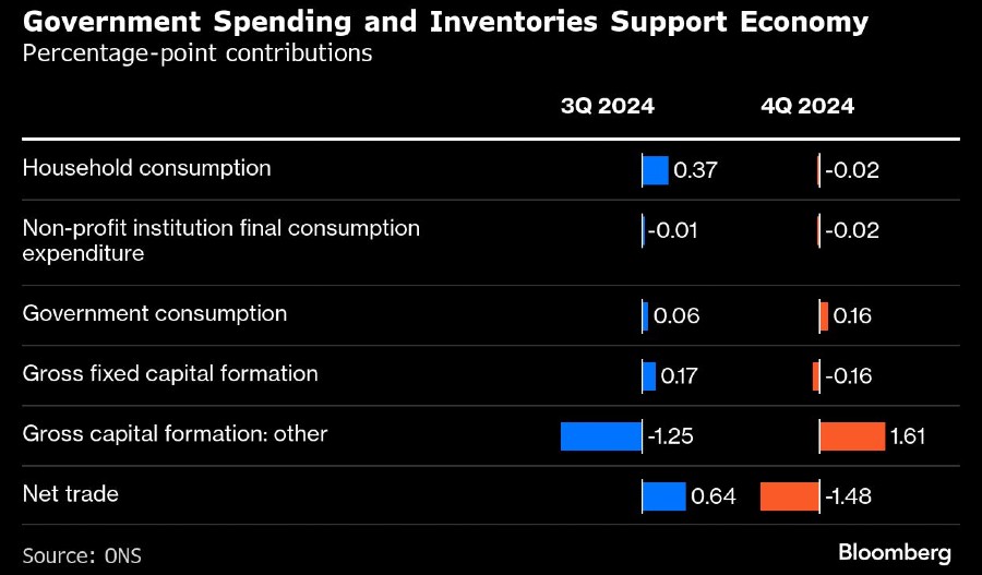 PDB hanya tumbuh 0,9% pada tahun 2024 secara keseluruhan. BOE memperkirakan pelemahan ekonomi akan merembet hingga tahun 2025, dan minggu lalu memangkas separuh perkiraan pertumbuhannya untuk tahun ini menjadi 0,7%.