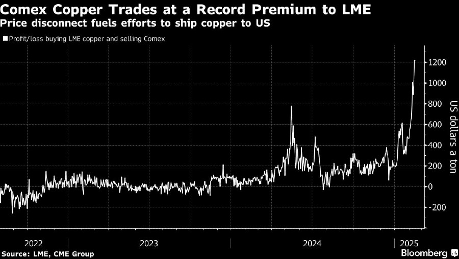 Pasar tembaga global mengalami dislokasi ekstrem karena potensi tarif pada logam industri utama tersebut mendorong rekor kesenjangan antara harga AS dan global minggu lalu. Presiden AS Donald Trump mengancam akan mengenakan tarif pada tembaga, meski belum mengatakan berapa atau kapan tarif tersebut akan dimulai.