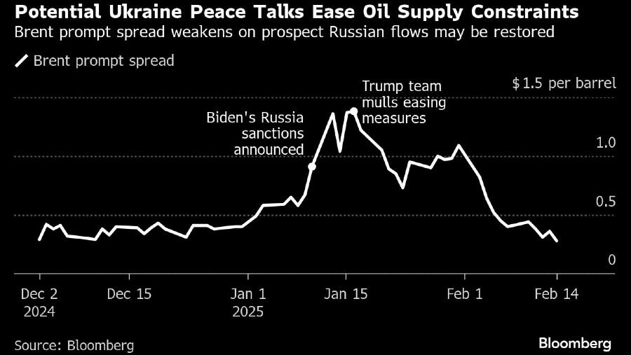Selisih harga Brent — yang melebar saat persediaan jangka pendek diperkirakan langka dan menyempit ketika stoknya melimpah — melonjak bulan lalu karena para pembeli mencari pengganti minyak Rusia setelah adanya pembatasan baru yang ketat dari pemerintahan Trump.