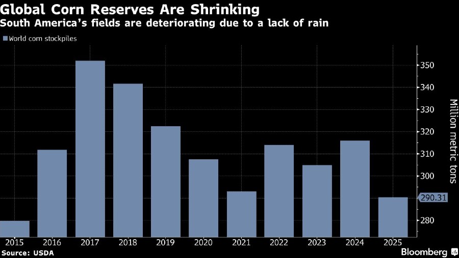 Kekeringan yang terus-menerus di Argentina dan sebagian wilayah Brasil memaksa Departemen Pertanian AS untuk menurunkan proyeksi stok jagung global saat inflasi pangan tetap tangguh. Lembaga ini melihat cadangan sebesar 290,3 juta metrik ton, level terendah dalam empat tahun terakhir, dan kontrak berjangka diperdagangkan mendekati level tertinggi sejak Agustus 2023 di Chicago.