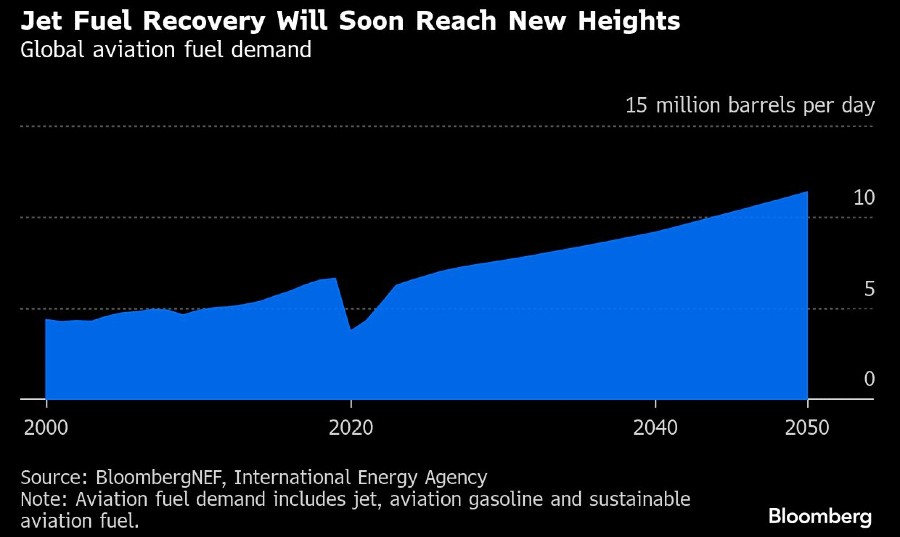 Ini mencakup campuran bahan bakar jet, bensin penerbangan, dan bahan bakar penerbangan berkelanjutan. Lebih dari 40 maskapai penerbangan telah menetapkan target untuk mencapai penerbangan nol emisi pada tahun 2050, tetapi menurut BNEF, hal tersebut tidak akan tercapai tanpa "intervensi kebijakan yang signifikan" yang dibarengi dengan perkembangan teknologi.