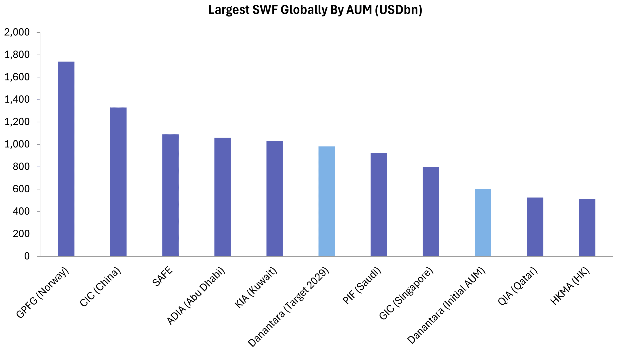 Sebagai awalan, aset Danantara diperkirakan mencapai US$ 600 miliar. Ini akan menjadikan Danantara sebagai 10 besar SWF dengan aset kelolaan terbanyak di dunia.