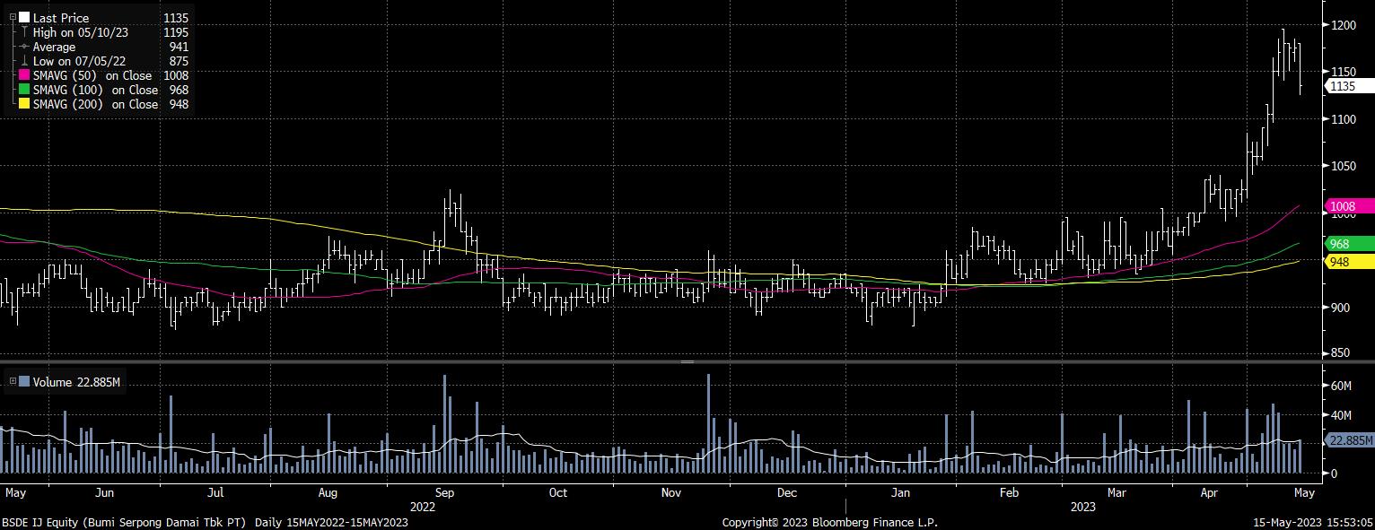 BSDE dengan target harga Rp1.220 - Rp1.225 sampai dengan Rp1.280 - Rp 1.290/saham. Stop loss dengan range Rp1.130 - Rp1.120/saham. Rekomendasi entry level pada Rp1.170 - Rp1.165/saham.