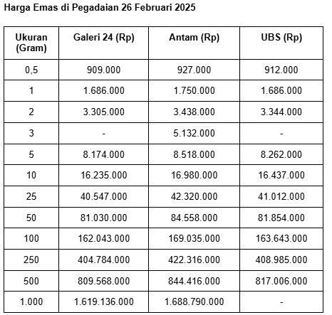 Lalu untuk emas batangan Galeri 24 ukuran 0,5 gram, Pegadaian menjual di harga Rp 909.000. Terangkat Rp 1.000 dalam sehari.