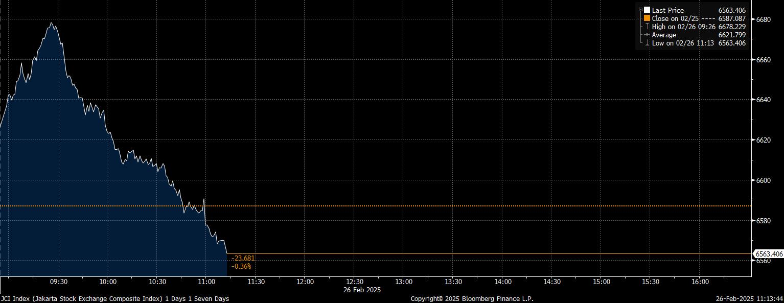 Bloomberg Technoz, Jakarta - Indeks Harga Saham Gabungan (IHSG) balik arah. Pada perdagangan Sesi I Rabu (26/2/2025) jelang siang hari, IHSG kembali ada di zona merah dengan kehilangan 23,68 poin (0,36%) ke level 6.563,4.
